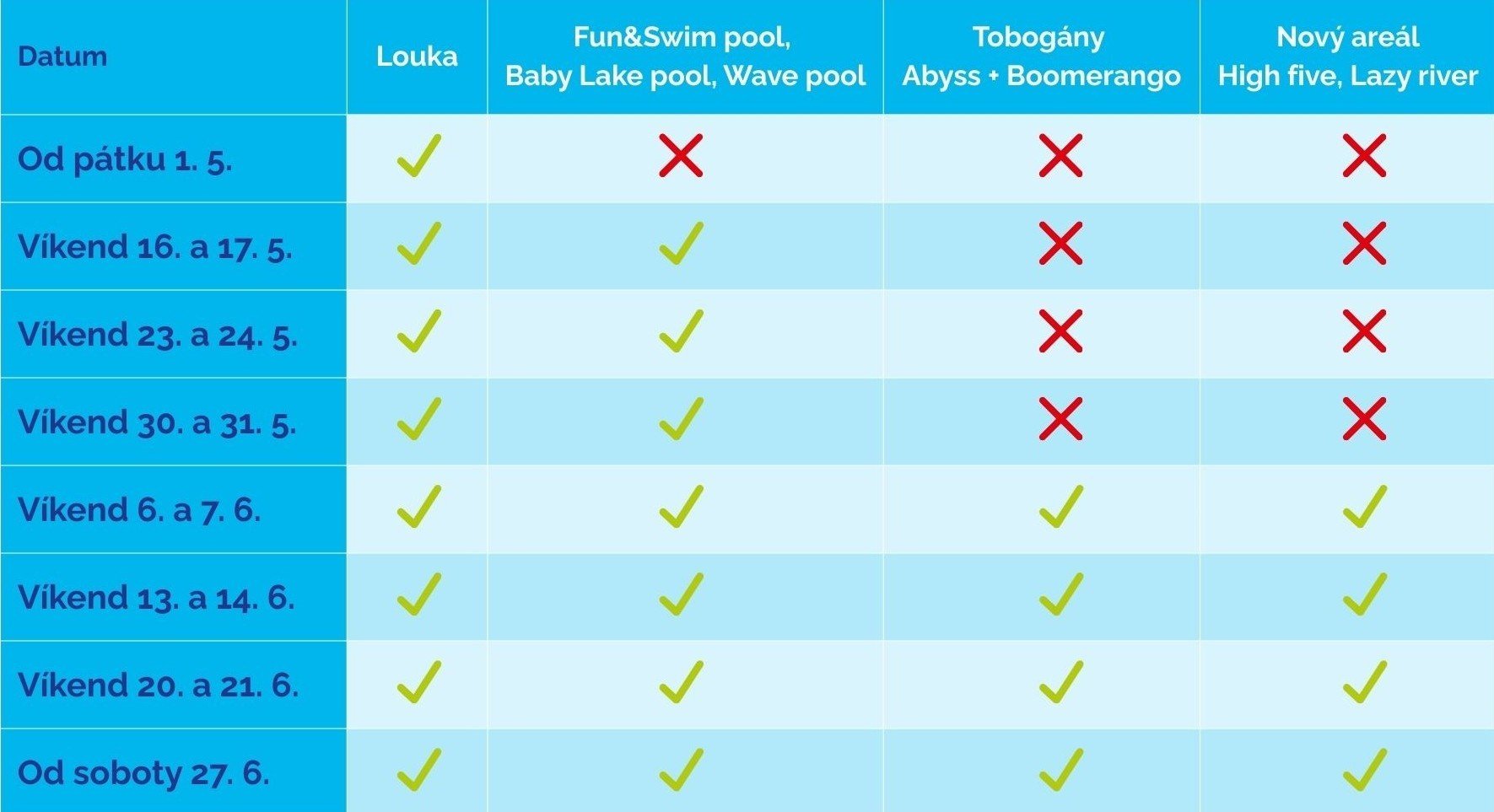 Der Sommerbereich ist nur an den Wochenenden im Mai und Juni bei gutem Wetter geöffnet. Auf der Website www.aqualand-moravia.cz finden Sie Informationen zu den geöffneten Attraktionen .
